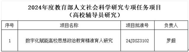 本站讯 近日,根据教育部社科司《关于2024年度教育部人文社会科学研究一般项目立项的通知》(教社科司函〔2024〕56号),学校获批1项2024年度教育部人文社会科学研究一般项目(高校辅导员研究专项)。