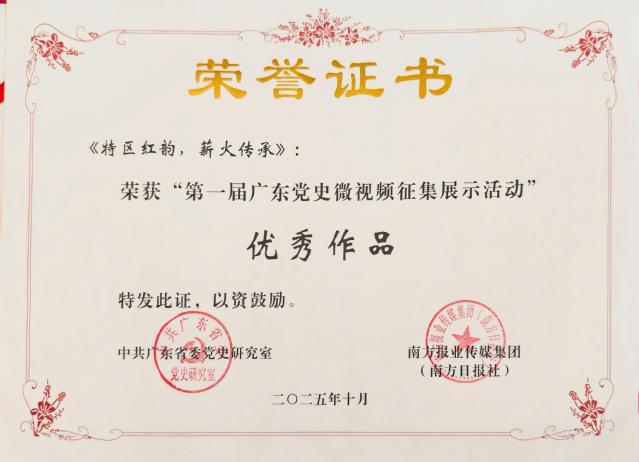 本站讯 10月14日,中共广东省委党史研究室与南方报业传媒集团联合举办的“第一届广东党史微视频征集展示活动”成果发布仪式在广州举行。我校教务部党支部报送的微视频《特区红韵,薪火传承》在千部作品中脱颖而出,荣获“优秀作品”。