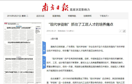 《南方日报》特邀我院院长陈斗雪发稿评论“现代学徒制”