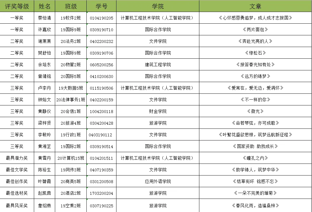 来自国际合作学院的参赛学生在比赛颁奖现场动情地说“我手写我心,我文筑我梦。通过参与本次征文活动,我近距离了解了需要资助的贫困同学群体,被他们坚持圆梦,自强不息的精神打动,让我更加珍惜看似普通平常,实则得来不易的学习机会,未来更要努力奋斗,实现价值。”