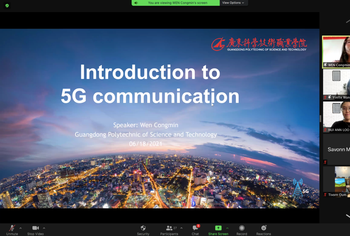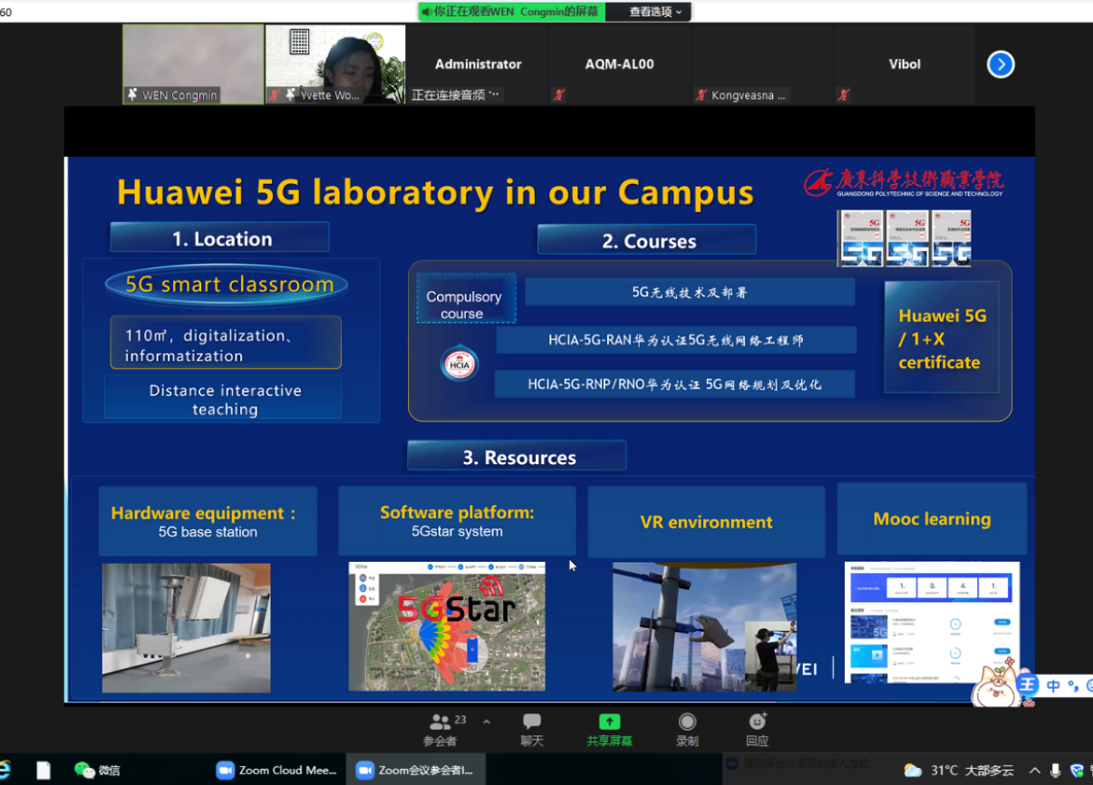 培训讲师来自计算机网络技术专业教师文聪敏,全程采用英语授课,围绕“5G通信”主题展开讨论5G技术发展过程、关键技术实现与行业典型应用,同时还分享交流了学校与华为合作在5G虚拟仿真实训方面的成果。双方在培训问答环节共同研讨了5G未来的发展方向以及5G如何促进发展中国家科技进步的战略性问题。