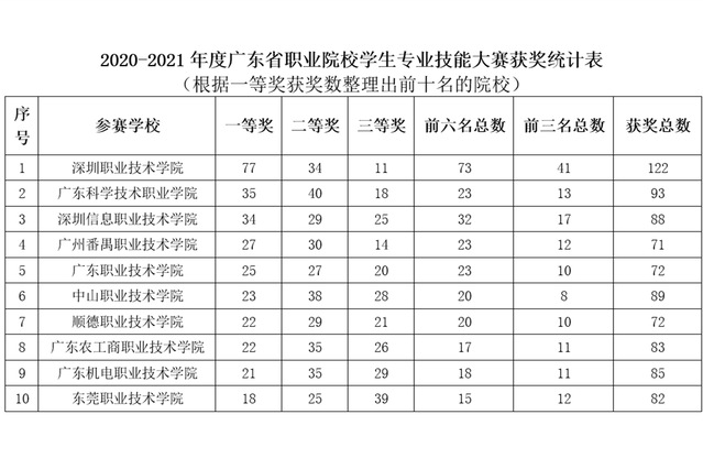 本站讯 近日,广东省教育厅公示了2020-2021年度广东省职业院校学生专业技能大赛获奖名单,我校共派出96支代表队参加65个赛项的角逐。在指导老师精心指导、选手们顽强拼搏下,取得了优异成绩,共斩获93个奖项,其中一等奖35项、二等奖40项、三等奖18项。根据公示数据统计我校一等奖获奖数排名全省第二,彰显了我校在专业建设和人才培养质量上所取得的丰硕成果。