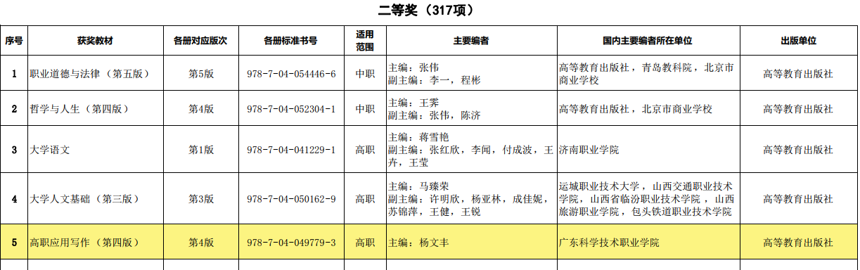 本站讯 7月2日,教育部发布“关于首届全国教材建设奖拟奖励名单的公示”,我校杨文丰教授主编的《高职应用写作(第四版)》、闵文婷老师(第二主编)的《Dreamweaver CS6网页设计立体化教程(双色微课版)》教材均拟获二等奖。
