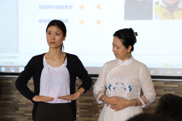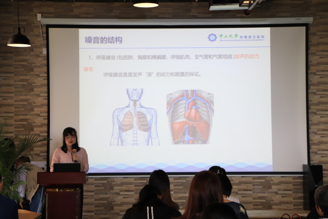 据权威调查统计,教师的嗓音障碍发病率高达46.6%,一线教师在传道授业解惑之时,时常会出现了嗓子疲劳、嗓音沙哑、甚至出现疼痛等症状,为众多职业之首。中山大学附属五院耳鼻咽喉、头颈外科的嗓音疾病诊疗团队米姣平主治医师深入浅出的向老师们讲解了嗓音的结构,阐述了教师职业病病发的原因以及影响,介绍了关于人体发声器官、声带、共鸣腔体等相关知识,让老师们从理论上掌握了发声的原理。李永芳护师从科学的呼吸方式、合理的口腔控制、正确的共鸣方式和适当的放松疲劳四个方面,以互动的方式为大家现场指导如何正确发声。