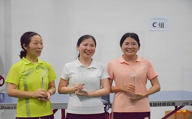 本次比赛的赛制采用每局11分制,小组赛采用三局两胜制,淘汰赛采用三局两胜制,决赛采用五局三胜制。经过小组赛和淘汰赛激烈角逐,选手们疲惫却热情不减,最终,唐老师、姚老师、曹老师三位教师分别荣获冠军、亚军和季军。