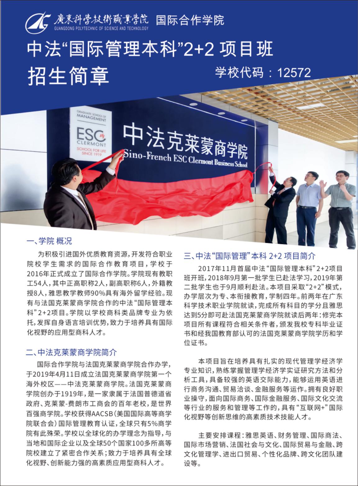 一、学院概况为积极引进国外优质教育资源,开发符合高等职业院校学生需求的国际合作教育项目,学校于2016年正式成立了国际合作学院。学院积极融入并推进“一带一路”倡议与“粤港澳大湾区”国家战略的建设,建立多...