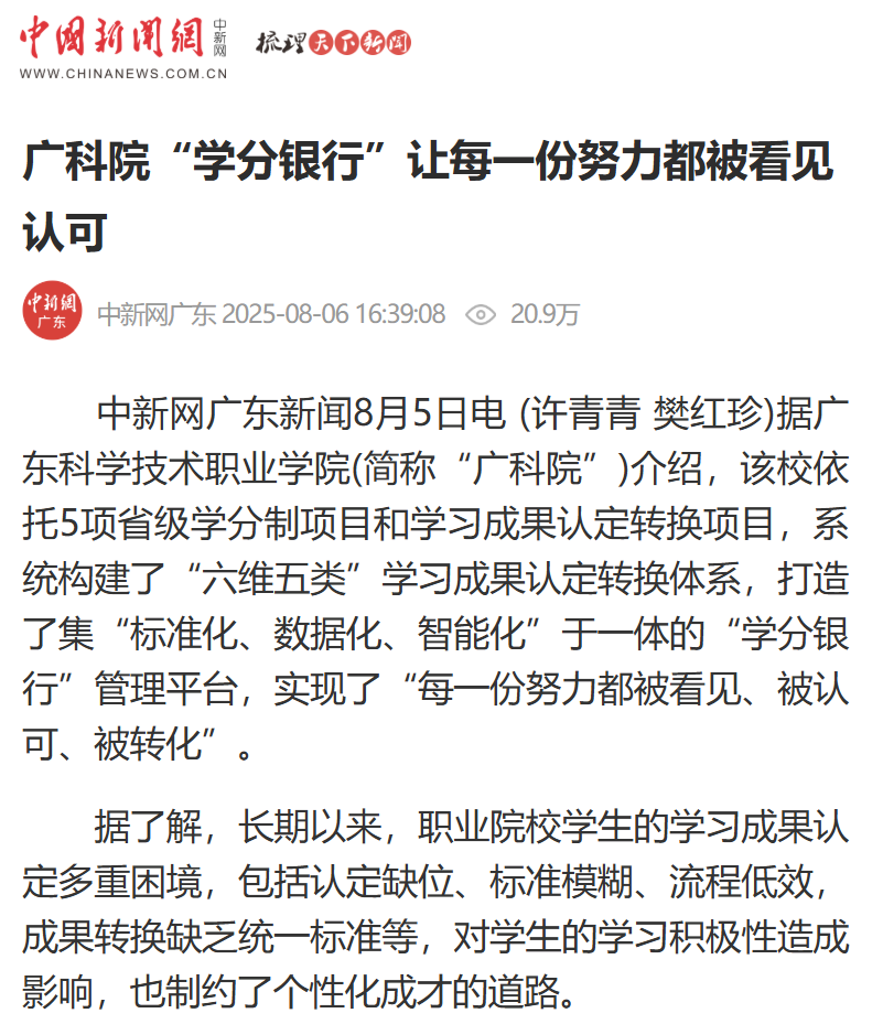 中国新闻网《广科院“学分银行”让每一份努力都被看见认可》