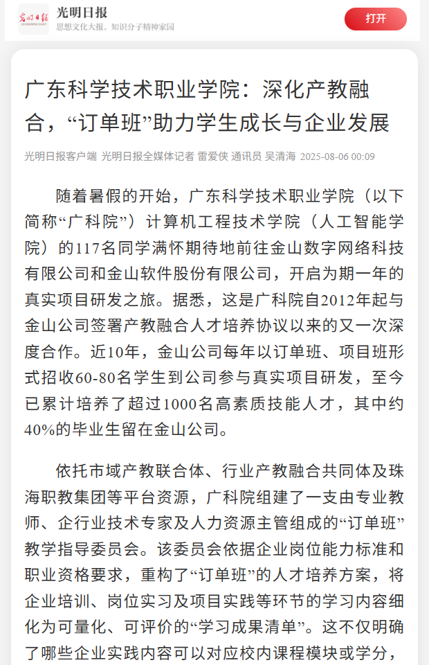 光明日报《广东科学技术职业学院:深化产教融合,“订单班”助力...
