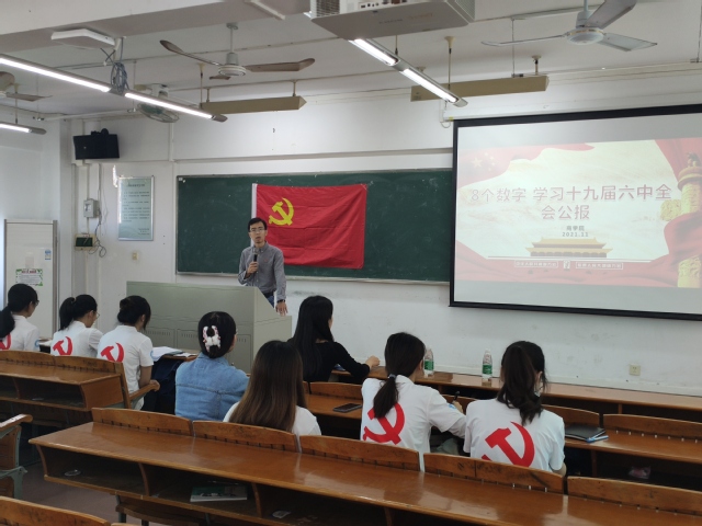 会上支部委员领学《中国共产党第十九届中央委员会第六次全体会议公报》,传达学习习近平总书记在党的十九届六中全会上关于中央政治局工作的报告,激励学生党员要从思想上、学习上、行动上等各个方面严格要求自己,提升自己,努力成为社会主义的建设者和接班人。