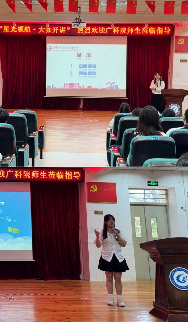 本站讯 为精准对接职业教育不同学段学生的成长需求,5月27日至28日,商学院师生团队走进珠海市理工职业技术学校(以下简称“珠海理工”),成功举办了两场主题鲜明、针对性强的“星光领航,大咖开讲”师生交流分享会。活动吸引了经贸系电子商务、市场营销专业共计445名师生参与。现场反响热烈,为不同年级的学生提供了切实可行的发展指引。 5月27日,首场讲座聚焦毕业班学生。商学院移动商务专业主任郑延教授以“升学就业双通道:中职阶段如何为未来加分”为主题,深入分析了当前升学与就业的新趋势,通过清晰的逻辑框架和生动的案例分析,引导学生根据自身特点做出最优选择。她强调,扎实的专业技能是职业发展的基石,而科学的升学规划则是提升核心竞争力的关键;特别鼓励毕业生们积极参与技能竞赛、考取行业权威证书、积累实践经验,为未来无论是就业还是升学奠定坚实基础。 5月28日,第二场讲座面向高一、高二在校生。郑延以“兴趣驱动职业发展:职校生如何规划未来”为题展开分享。随后,商学院24级电商7班冯章佩以学姐身份重返母校,带来主题演讲“从舞蹈到直播:兴趣重塑职校生的未来”。她回顾了自己考入广东科学技术职业学院的奋斗经历,并分享了如何将热爱的舞蹈与电子商务专业技能结合,在直播电商领域找到了属于自己的发展路径。此外,商学院23级物流3班周雨涵同学以“走进广科:我的多彩大学生活”为题,展示了广东科学技术职业学院丰富的学术资源、多元的社团活动以及广阔的成长平台。活动结束后,现场学生积极与她们互动交流。 本次活动创新性地根据学生不同发展阶段的需求,分设两场专题讲座,实现了精准赋能,不仅是校际协同育人的生动实践,更是中高职贯通培养模式改革的有益探索。未来,商学院与珠海理工将继续秉持“协同创新、资源共享、优势互补、共同发展”的理念,深化纵向衔接,共同构建贯通培养、协同发展的职业教育新生态,为培养新时代高素质技术技能人才持续注入新动能。 撰稿:闫鑫 摄影:朱超文 初审:郑延 复审:赵莉 终审:刘电威 |