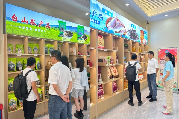 团队第一站前往坐落在台城历史文化街区的台山优品线下门店,通过收集线下门店销售数据、市场动态进行选品组合分析,为线上抖店运营提供参考依据。店内商品琳琅满目,覆盖了台山主要的特色农产品,如白菜干、乌豆、鸡爪芋、虾酱、耗油等,企业工作人员向团队耐心介绍了不同农产品的销售情况,也提供了很多运营思路。