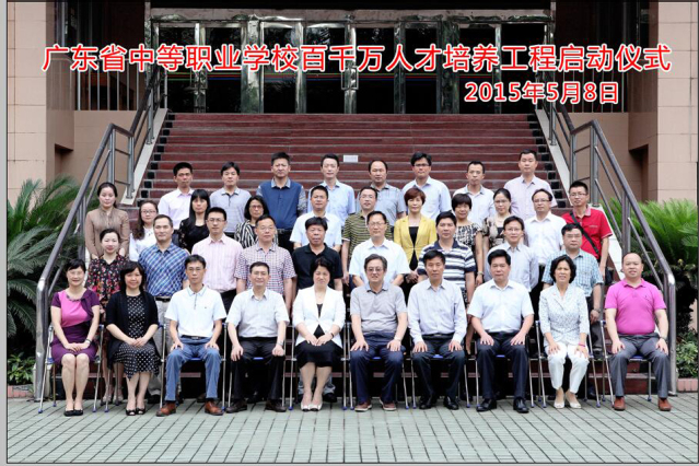 中等职业学校“百千万人才培养工程”项目是广东省教育厅为进一步加强中等职业教育人才队伍建设,打造我省中职学校高层次领军专业人才队伍,提高中等职业教育办学水平而启动。该项目面向全省中等职业学校在职教师、校长及职业教育研究机构在岗人员进行选拔,经过资格审查、材料评审、答辩评审等评审程序,确定27人为首批培养对象,其中职教名家培养对象4名、名校长培养对象4名、专业名师培养对象19名。2015年5月8日该项目启动仪式在我校隆重举行,培养周期为四年。