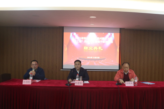本站讯 由国家科技部立项,西藏自治区科技厅主办,广东省科技干部学院承办的2021年 “科技兴藏人才培养工程”西藏科技管理干部培训班于2021年11月23日在广东省科技干部学院圆满落幕。西藏自治区科技厅法规处处长肖建新,广东省科技干部学院党委委员、继续教育学院院长袁晓斌和全体学员出席结业典礼。结业典礼由继续教育学院副院长彭劲松主持。方奇、贾弘毅、扎西平措、宋明四位学员分别代表各小组发言,袁晓斌作培训小结,肖建新代表西藏自治区科技厅讲话,最后领导为学员们颁发结业证书。