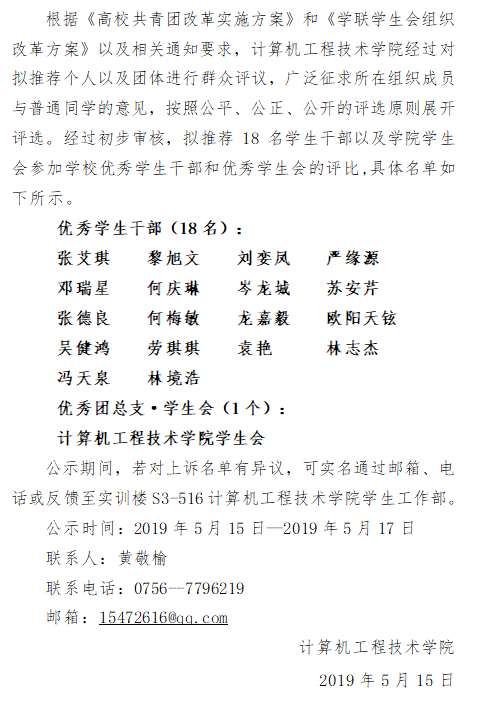 学院推荐2018-2019年优秀学生干部及优秀学生会公示