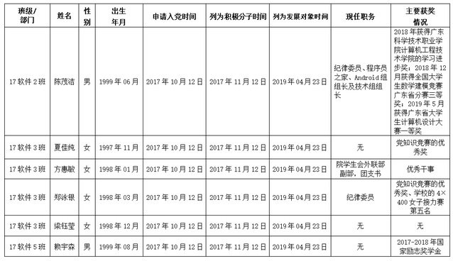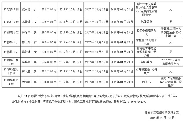 学院党总支2019年上半年拟接收为中共预备党员公示