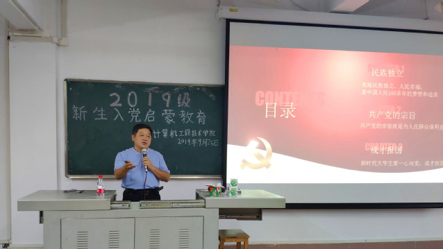本站讯(通讯员:胡烨佳、莫伟澜、刘远萍 摄影:陈玉熔、刘健锋)新生入党启蒙教育是党员教育的基础,是激发学生政治热情、积极向党组织靠拢的关键阶段。为使广大新生增强对党的认识,提高思想觉悟、政治意识,端正入党动机,积极向党组织靠拢,结合“不忘初心、牢记使命”主题教育,2019年9月26日晚,由计算机工程技术学院党总支书记齐向东主讲的“一颗红心向党,立志成才报国”的主题党课在教一511顺利举行,200余名2019级计算机学院新生聆听了此次党课。