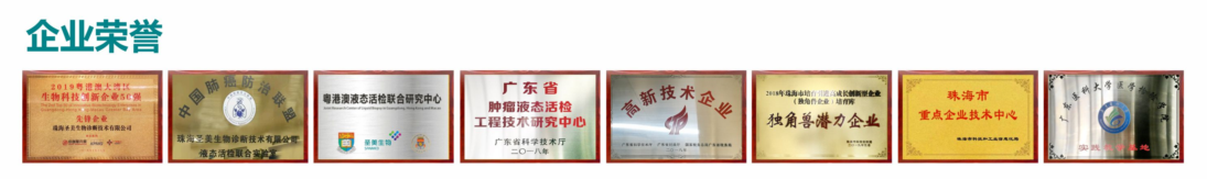 已被认定为:“国家高新技术企业” 、“国家科技型中小企业”、“国家规模以上工业企业”、“粤港澳液态活检联合研究中心”、“广东省精准医学应用学会理事单位”、“广东省医疗器械管理学会理事单位”、“广东省工程技术中心”、“珠海市重点企业技术中心”、“珠海市独角兽潜力企业”、“珠海市香洲区中小企业成长工程培育企业”、“中国CTC产业联盟副理事长单位”。