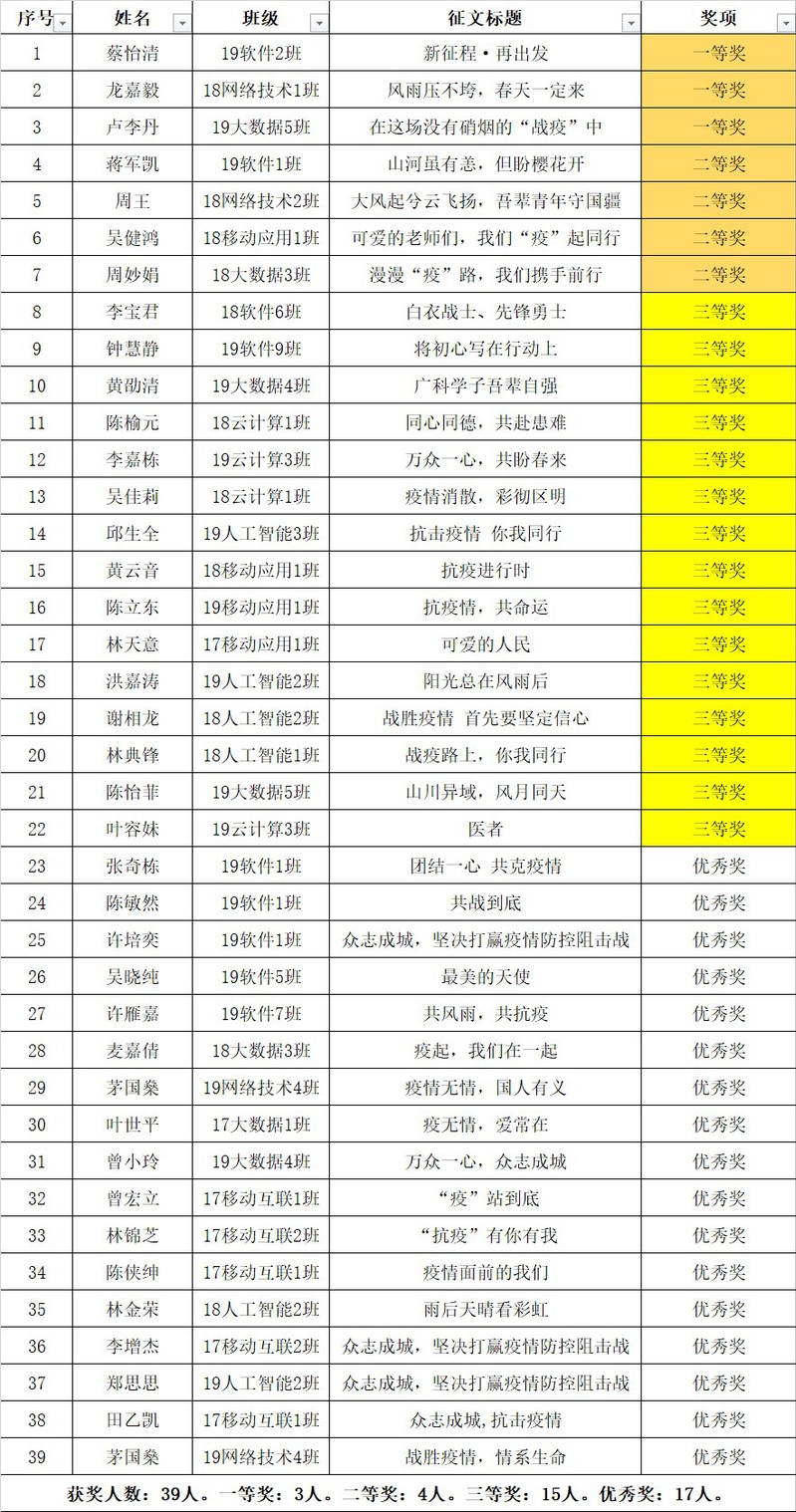 学院于2020年2月开展了“众志成城,坚决打赢疫情防控阻击战”征文活动,共收到师生征文作品共57篇。经学院评审,评选出学生作品一等奖3名、二等奖4名、三等奖15名、优秀奖17名。现将评选结果公示如下: