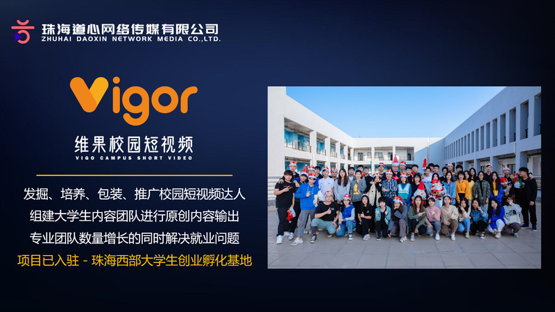 珠海道心网络传媒有限公司,主要运营维果校园短视频,旨在发掘、培养、推广校园小视频、短视频达人,并向短视频行业输送优质内容创作者,输出具有原创小视频、短视频内容拍摄的创意性演员、视频制作与后期、新媒体平台运营等各个领域的创新型人才,以新媒体之力,用心传播大学生校园文化,实现青年创作者的影像梦想。