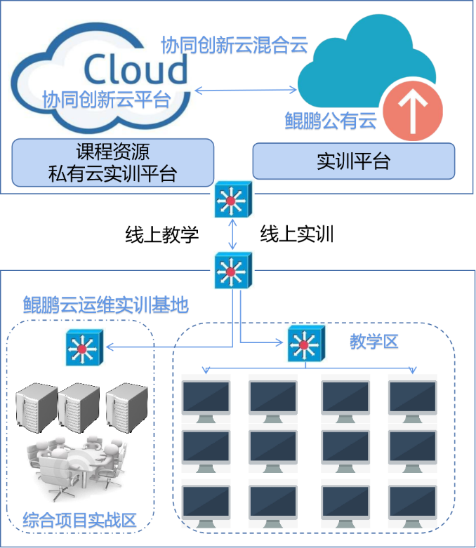 本中心以市场为导向,按照校企合作、工学结合和岗证一体的人才培养模式,建成完整统一、技术先进、项目齐全、应用深入的鲲鹏云运维实训基地。本基地面向鲲鹏云架构、运维、开发人才培养,开展基于鲲鹏云的专业建设、科研创新、技能竞赛、对外服务以及就业服务等项目,服务“湾区”地方经济与社会发展,培养云计算复合式创新型高素质高技能鲲鹏人才。基地既能满足云计算平台运维与开发认证课程的专业教学、技能实训、教学科研,也将满足教师培训需求,满足云计算领域社会职业技能培训需求,成为提供1+X云计算平台运维与开发师资培训和技术支持的服务示范基地。