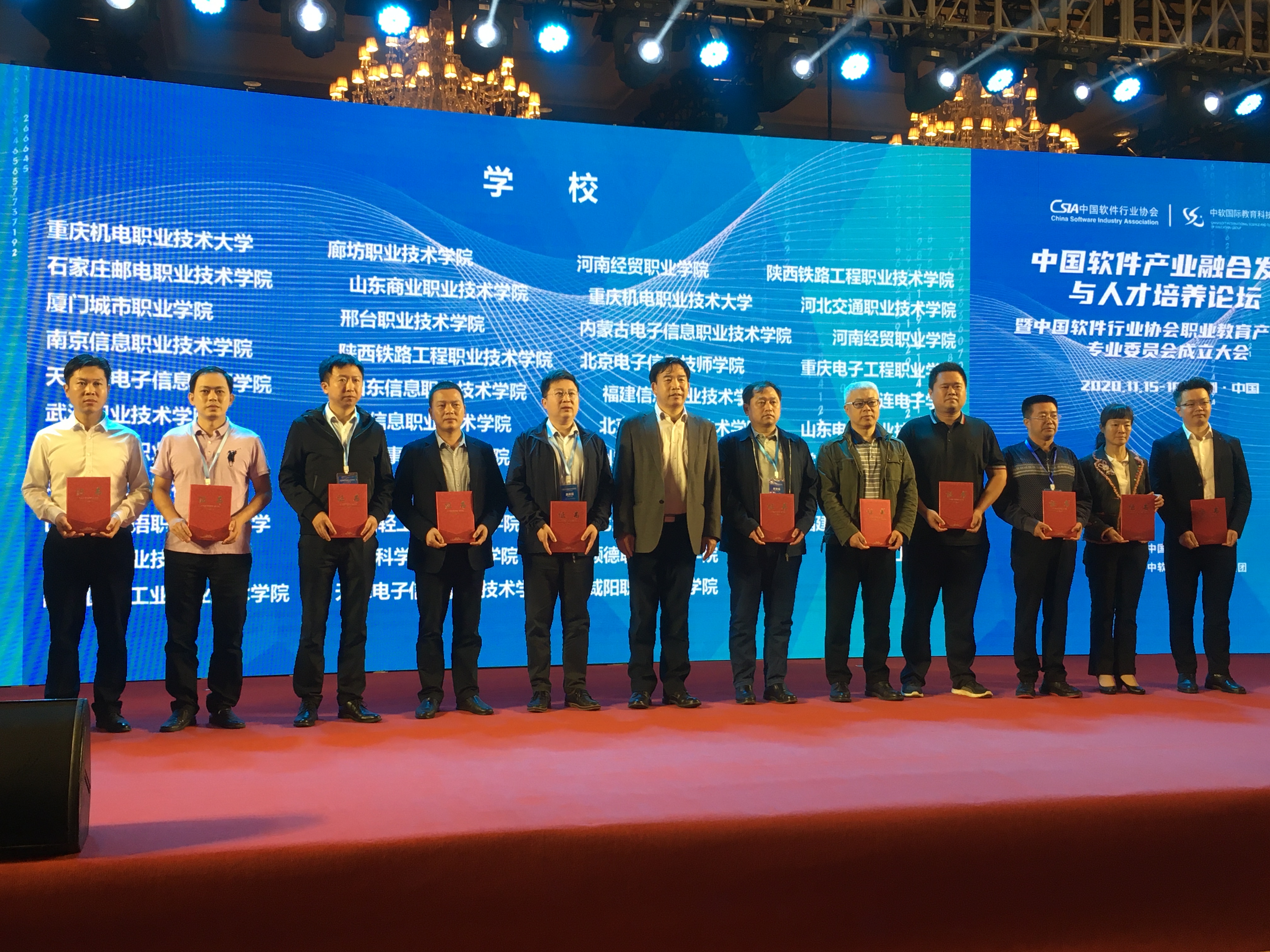 中国软件行业协会2020年6月批准成立职业教育产教融合专业委员会,该专委会旨在为企业和职业院校计算机软件类专业提供校企合作、产教融合服务,推进国家专业教学标准落实,推动职业教育改革纵深发展。广东科学技术职业学院成为该专委会的常务理事单位,杨忠明副院长作为代表上台领取证书。