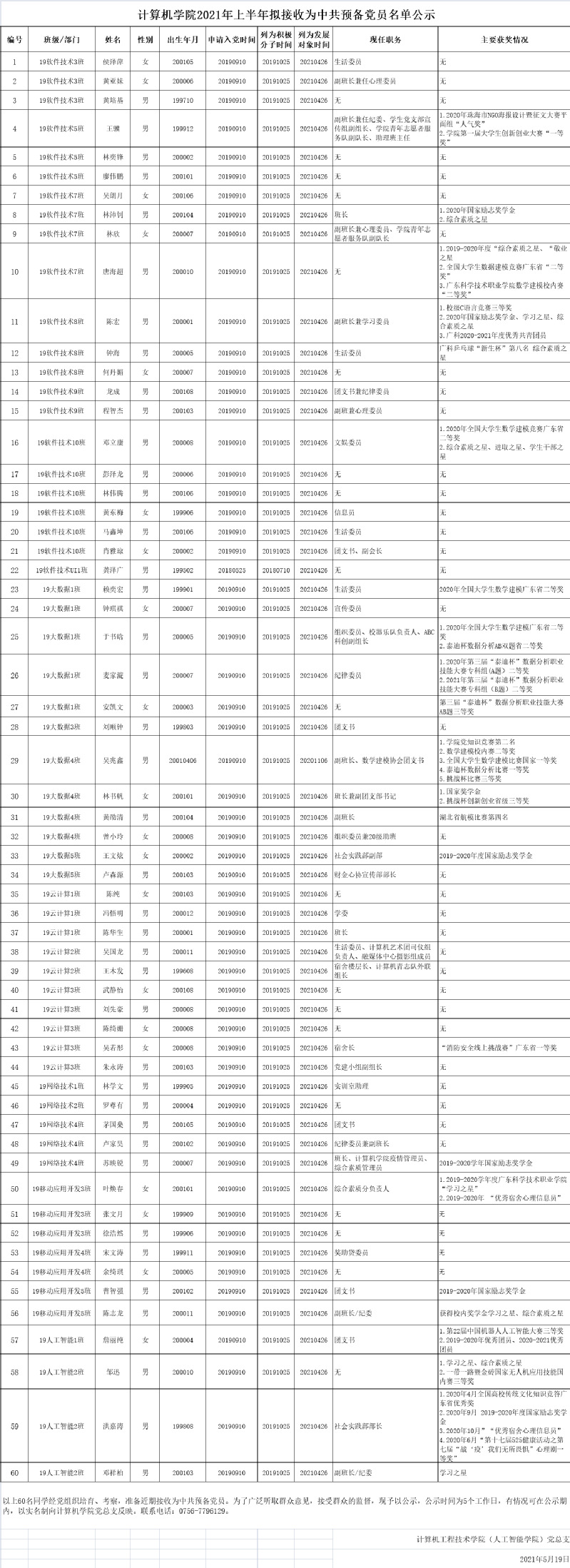 计算机学院2021年上半年拟接收为中共预备党员名单公示