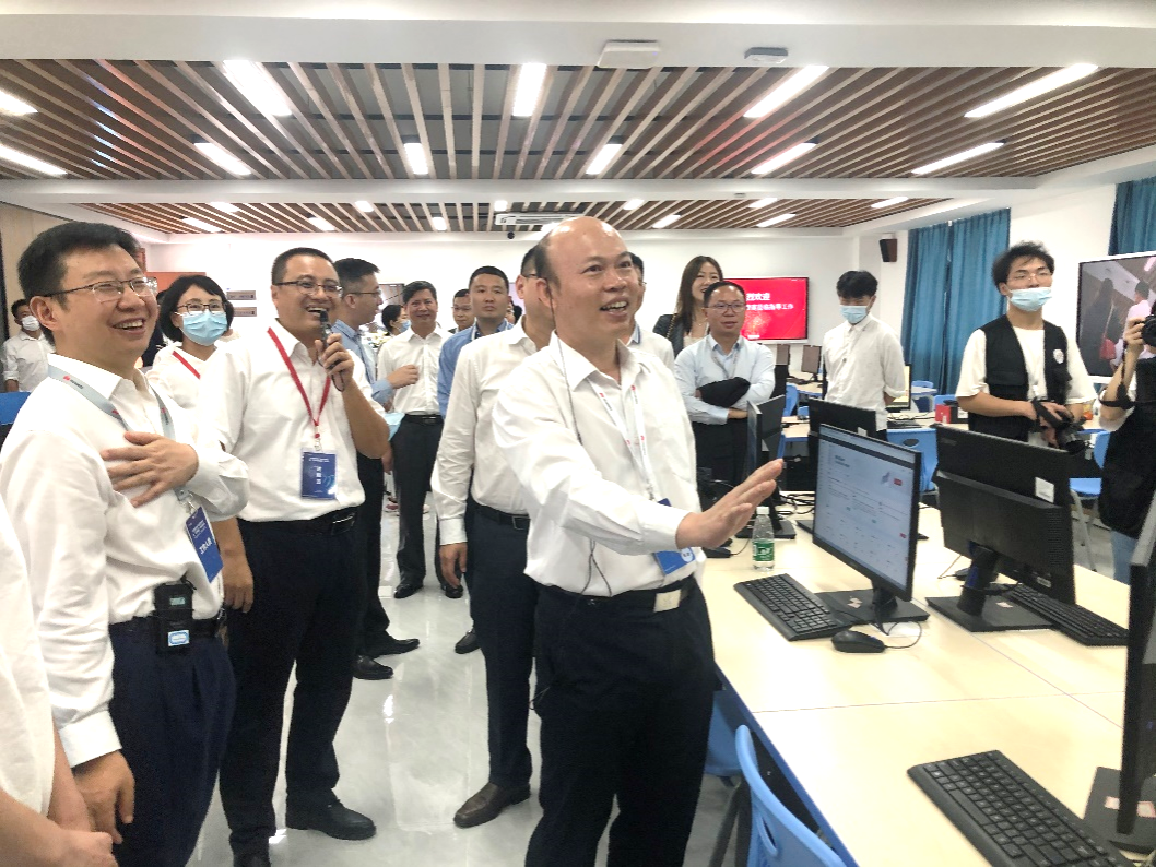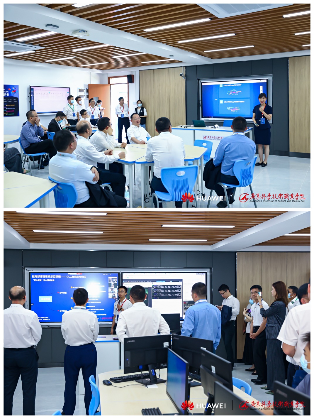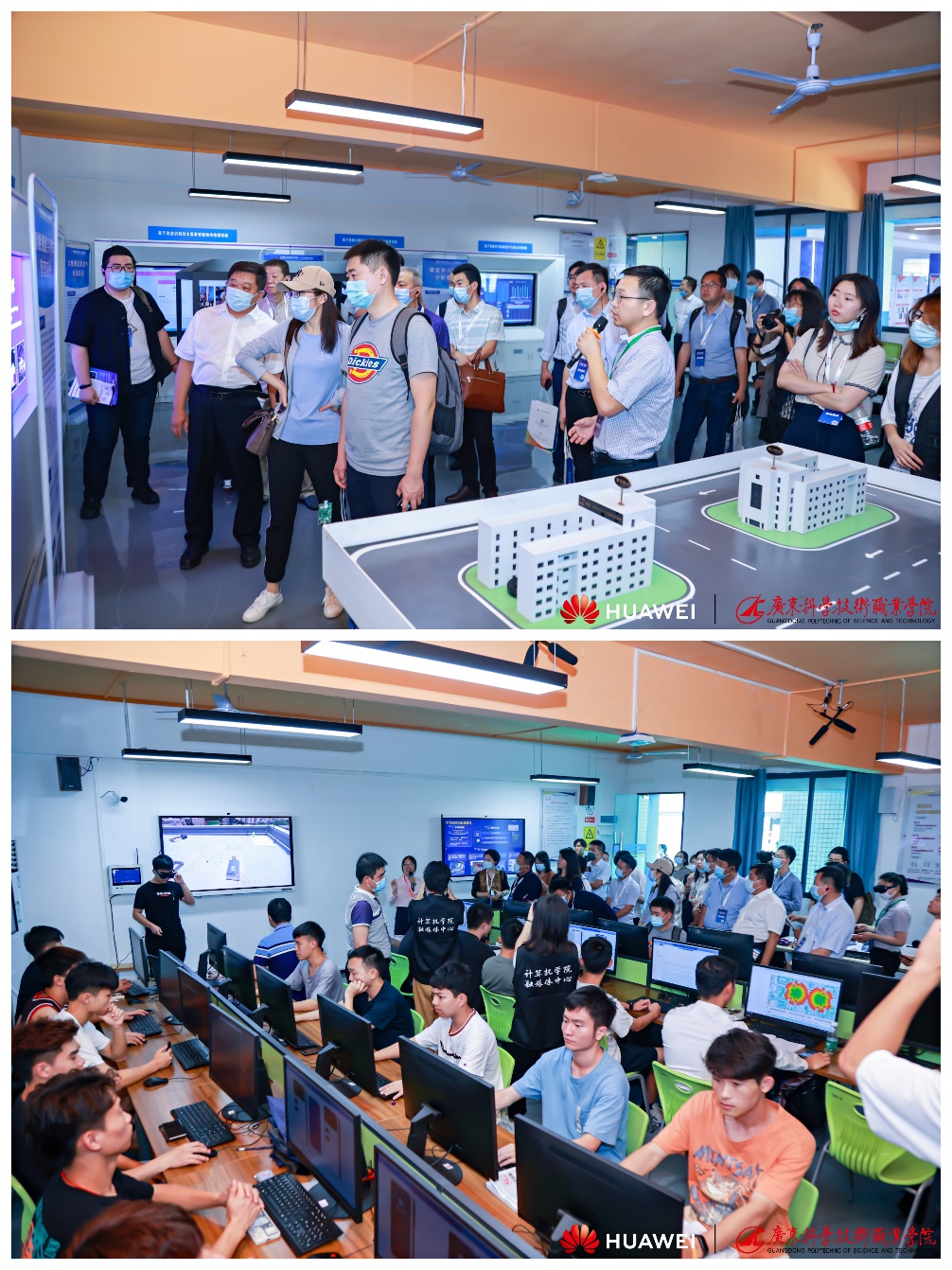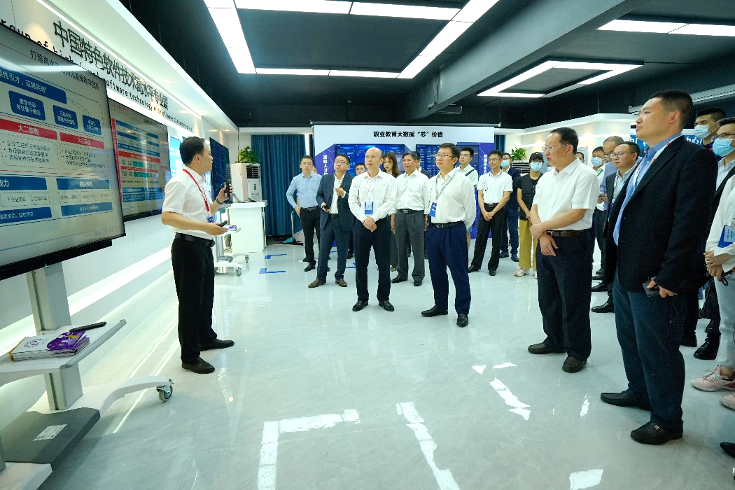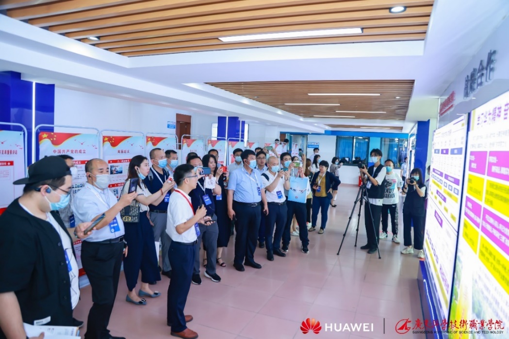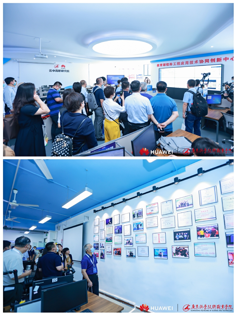 参观领导与嘉宾一行在(一楼)华为数字技术体验中心和教育部软件工程应用技术协同创新中心,观看了“云中广科”智慧校园“芯”实践展览、职业教育研究大数据、特高专业群项目化体系人才培养特色等成果展示。