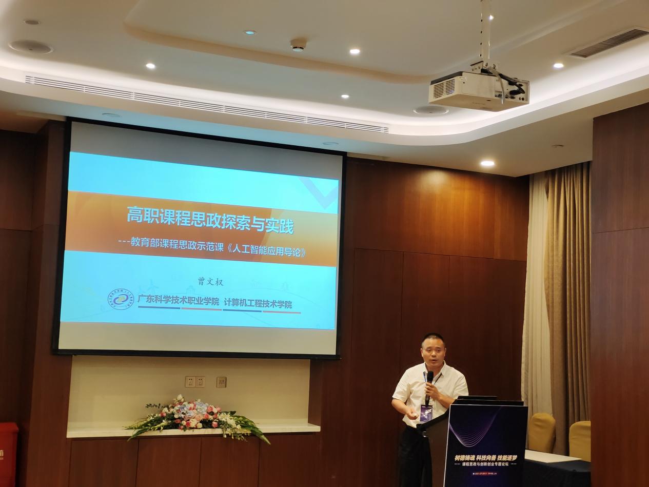 曾文权院长受邀以教育部课程思政示范课《人工智能应用导论》为例作高职课程思政探索与实践的报告,分享了课程思政建设的经验,坚持以学生为中心的教学理念,围绕“五熟、四能、三有”的教学目标,课程思政建设注重系统架构和立体化渗透,采用CBER四项规划的建设思路:课堂(Course)、基地(Base)、评价与反馈(Evaluation)、教学资源(Resource)。教学团队采用集体备课和教学反思,通过“挖掘—融入—再挖掘—再融入”动态迭代优化,共同完成“思政教育点”设计,梳理分散但相同的“思政教育点”形成五条“思政教育线”,整理聚合“思政教育线”形成四大“思政教育面”。形成系统的“点、线、面”课程思政元素,实现专业知识点与思政元素的有机融合。分论坛座无虚席,很多专家站着聆听曾文权院长深入浅出的课程思政经验分享,获得了在场100多位嘉宾的高度认可和一致好评,产生广泛的影响,体现我院“双高计划”建设成效显著,业内认可度加深,国内外影响力日增。