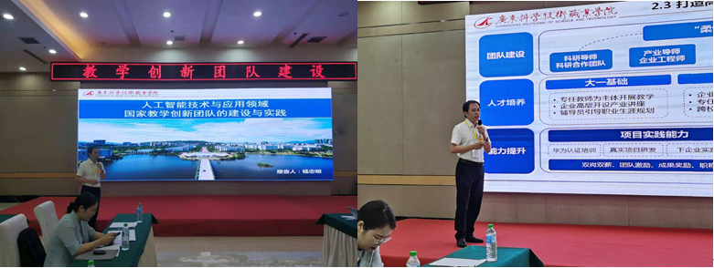 杨忠明主要从“三教”改革的思考、专业群教学创新团队建设路径、课程建设案例《人工智能应用导论》等方面介绍了我校国家级教学创新团队的建设新思路与成果,得到了与会专家、老师,以及企业代表的认可,并与参会代表进行了深入交流。