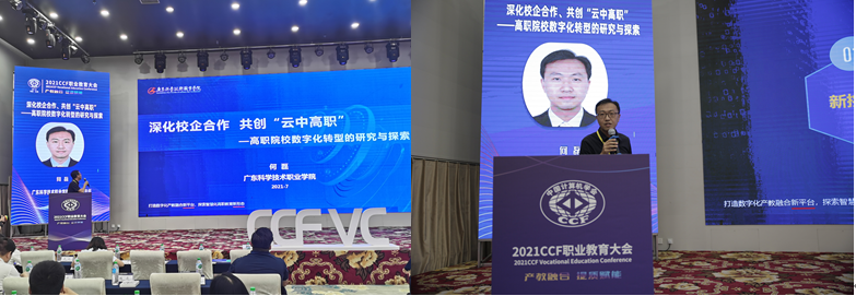 应大会组委会邀请,信息中心副主任(主持工作)何磊和计算机学院副院长杨忠明教授分别作《深化校企合作、共创“云中高职”——高职院校数字化转型的研究与探索》的主论坛报告和《人工智能领域国家教学创新团队的建设与实践》的分论坛专题报告。何磊主要介绍了学校与华为公司联合发起成立的“云中高职研究院”的建设成果与经验,重点阐述了我校鲲鹏数字人才培养、智慧校园建设与创新、职业教育大数据研究等方面的建设成效。