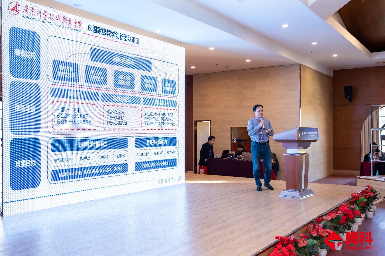 我校计算机学院副院长杨忠明教授做《华为鲲鹏数字产业学院的建设与实践》报告,结合高职教育现代产业学院建设要求,广东科学技术职业学院联手华为开展战略合作,对接产业需求,共建鲲鹏数字产业学院,打造一流信创特色的产业学院,创新 “1+1+N”合作共建机制,与十余家华为生态企业(“N”)累计投入400余万打造华为产业人才培养生态链。其中,腾科与广东科学技术职业学院共同打造应用创新实验室,完成本地化实验室、实训实训基地建设,通过仿真企业环境与企业管理,项目化教学培养ICT人才。目前已建成华为1+X网络系统管理实训基地、华为5G运维实训基地、人工智能应用创新中心(AI项目研发)、人工智能应用创新中心(昇腾AI应用研发)。