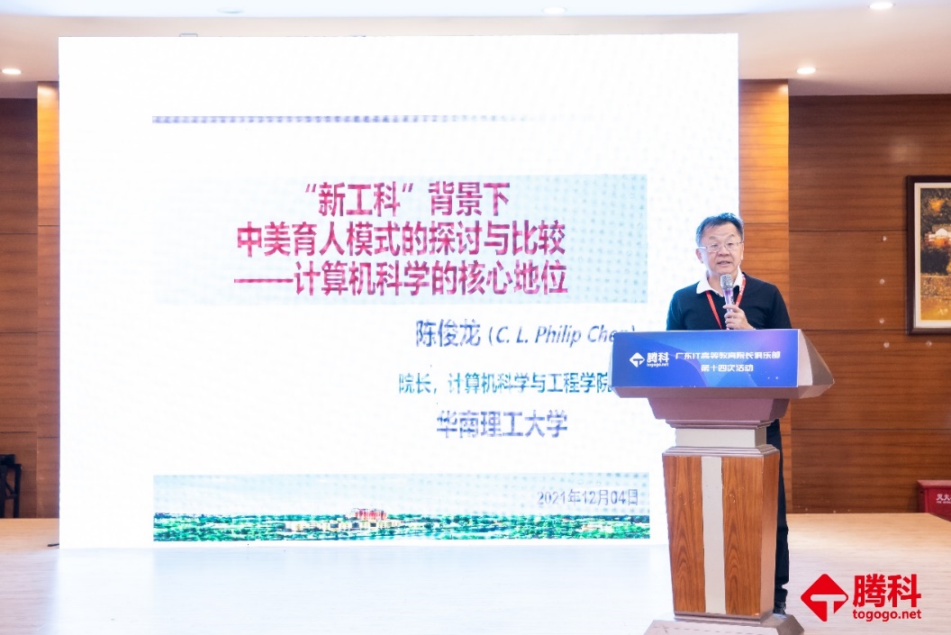 会议由广州腾科网络技术有限公司总经理唐慧主持。广东省计算机学会理事长韩国强教授做开幕致辞。欧洲科学院院士、欧洲科学与艺术院院士、华南理工计算机科学与工程学院院长陈俊龙教授发表《"新工科"背景下中美育人模式的探讨与比较——计算机科学的核心地位》的报告,通过中美育人模式的比较,阐述我国计算机的发展与人才教育现状,对“新工科”计算机人才培养课程进行解析。