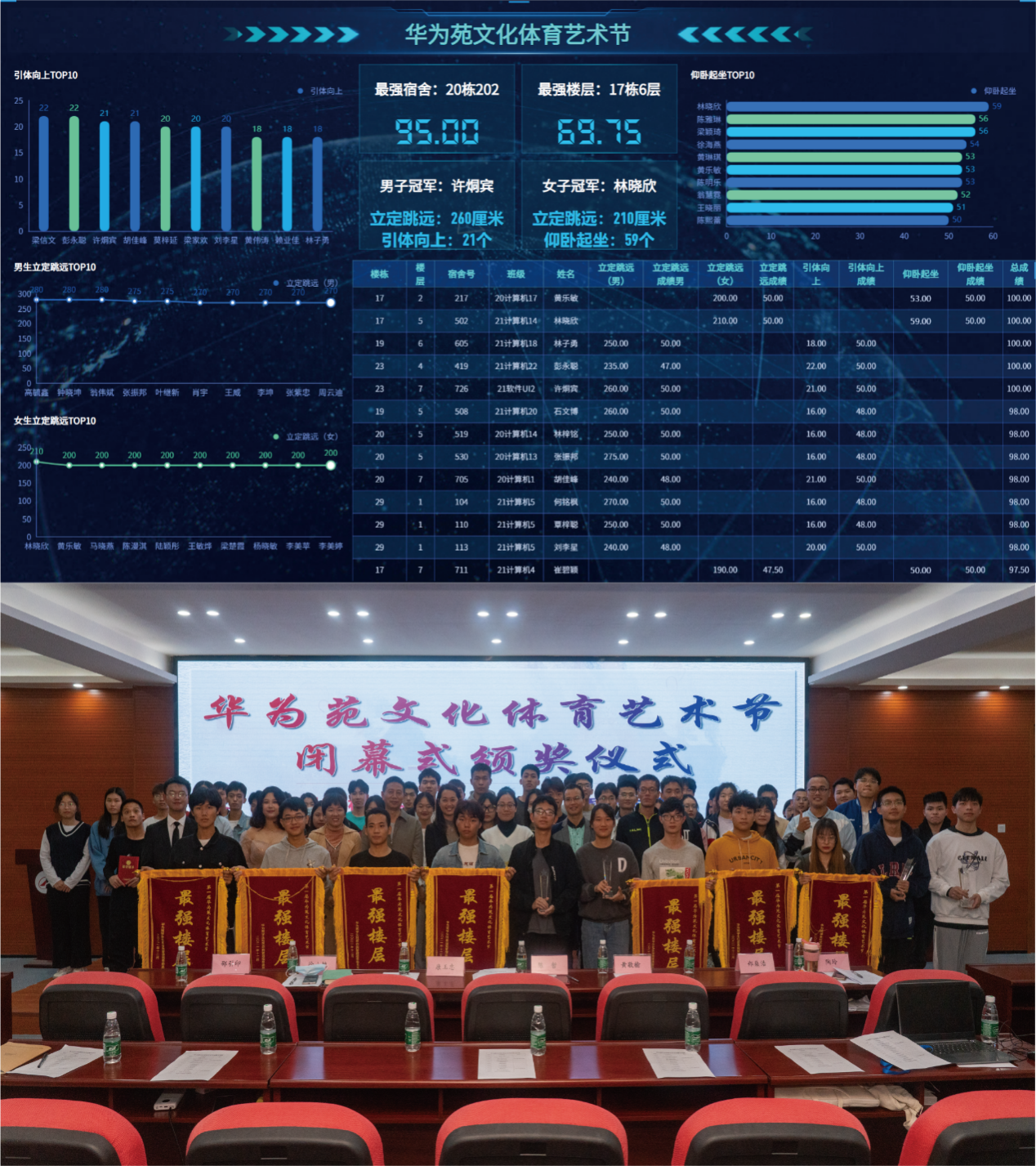 大数据可视化展示,挖掘数据价值。依托广科院和华为共建的职业教育大数据研究院,利用smartBI、奥威BI等可视化工具,将此次活动比赛数据进行分类整理,实时动态展示引体向上top10,立定跳远top10,仰卧起坐top10,最强宿舍,最强楼层,男女子冠军等各项比赛数据,同时利用可视化的直观性,深度挖掘数据价值,理清数据关系,实现数据多维动态分析,生成智能报表,张榜展示,激励和鞭策学生们团队协作、一起参加锻炼,共同进步,增强体质、健康发展。