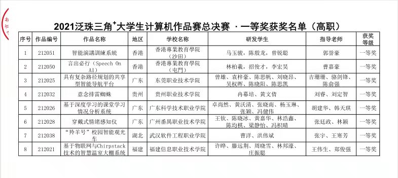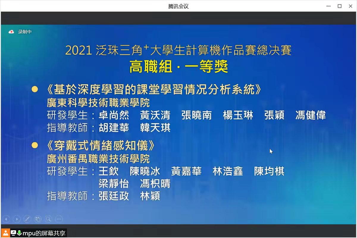 经过泛珠15个省市及港澳台地区严格选拔,有39支高校(高职组)队伍代表进入澳门总决赛,因受疫情影响,参赛作品采取线上远程答辩与评审。经过激烈角逐,最终计算机学院胡建华、韩天琪老师指导的作品《基于深度学习的课堂学习情况分析系统》荣获一等奖,获奖学生来自计算机学院人工智能技术应用专业的卓尚然、黄沃清、张晓南、杨玉琳、张颖、冯健伟同学团队。