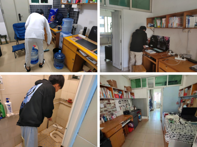 当前学校正处于“围合式”管理状态,宿舍成了同学们的主要学习和生活场所。在“校门紧闭,齐心抗疫;抗击疫情,你我同行”口号的带动下,同学们积极清扫寝室,做到人人都参与,个个有行动,合理分工,从上到下、从里到外,认真细致地对寝室进行全面彻底的清洁卫生大扫除,做到环境卫生不留死角,清洁消毒不留空白,整体寝室保持整洁、通风的状态。