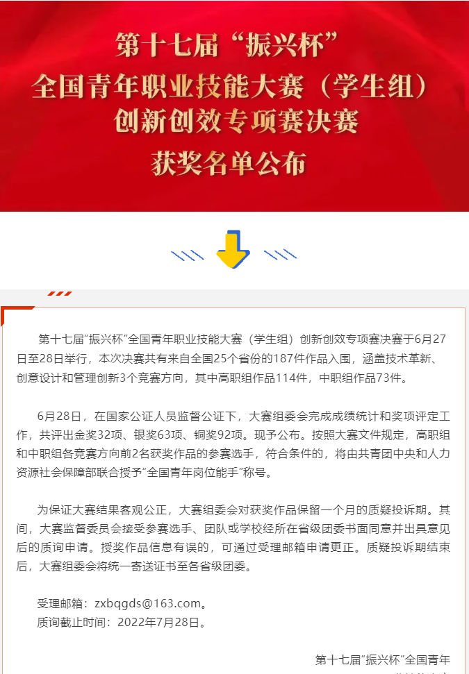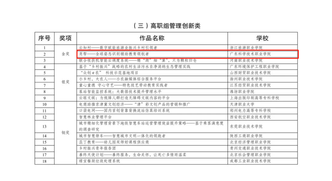 本届“振兴杯”共有来自全国25个省份的187件作品入围,涵盖技术革新、创意设计和管理创新3个竞赛方向,其中高职组作品114件,中职组作品73件。高职组管理创新类金奖全国仅3项。