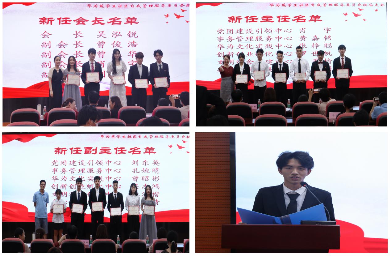随后,大会进行表彰、任聘仪式。陈哲、黄敬榆等先后为20级自管会干部颁发荣誉证书,为21级新任自管会干部颁发聘书。新任会长吴泓锐同学代表新一届自管会成员发言。他表示接过手中的聘书,倍感肩上的重任,承诺在今后会竭尽全力落实好各个中心的工作,带领同学们将自管会发展到新的高度,为同学们谋福利、办实事,鼓励华为苑自管会全体干部和同学肩负使命,坚定前行,争创佳绩,树立榜样!
