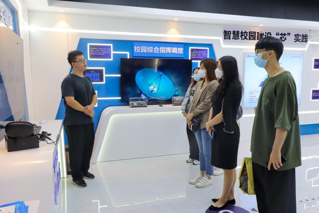 华为苑社区负责人陶玲带领唐伊韵一行5人首先参观了华为苑“一站式”学生社区,在学生服务中心了解华为苑学生社区建设,日常运行情况、学生志愿服务、科技文化节、文体艺术节等开展情况,并走访了华为苑社区部分宿舍。接着参观了华为数字技术体验中心、华为鲲鹏数字产业学院、软件工程应用技术协同创新中心、人工智能应用技术开发中心无人机研发团队。