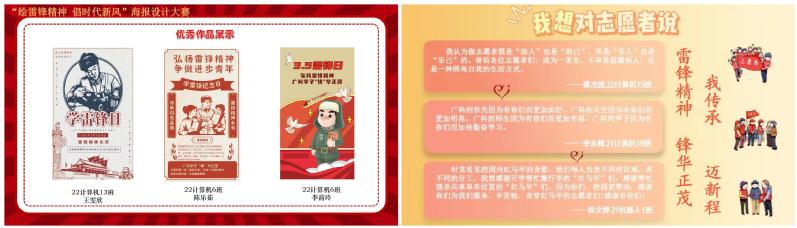 赓续雷锋精神,寻找新时代雷锋。在“发现身边的活雷锋”征集活动及雷锋精神海报设计大赛中,投稿人提笔书写新时代学雷锋楷模,续写身边的平凡故事:当需要帮助时,有人慷慨解囊,舍小家为大家;当疫情抗战时,有人临危不惧,不求回报,只留下最美背影,这是新时代对雷锋精神的诠释。展示在华为苑社区文化宣传智慧屏的优秀海报设计作品是同学们怀着“传承雷锋精神,传递青春力量”的热忱,以新颖的创意和出众的设计水平致敬雷锋同志,引导同学们将精神文化转化为具体行动,在实践中体会雷锋精神的时代内涵和重要意义。