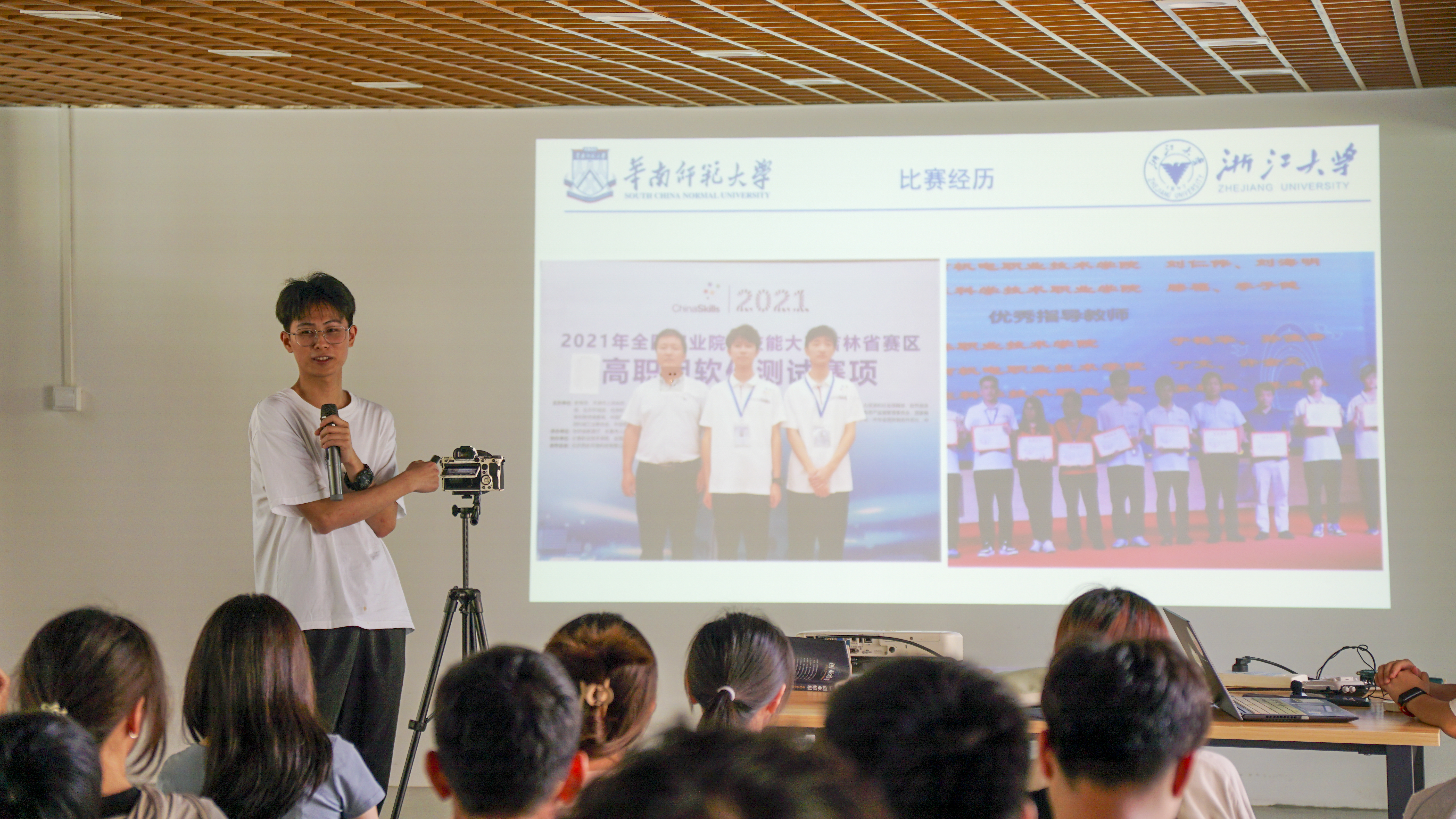 分享会上,滕福主要从竞赛和升学两个方面向同学们分享了自己经历和感悟。2018年,滕福参加广东省3+证书高考成功考入广东科学技术职业学院软件技术专业,通过大一对计算机专业知识的学习,本着“以赛促学、以赛促练”理念,他积极参加各类专业技能竞赛,连续两年参加了广东省职业院校技能大赛软件测试赛项获得一等奖,并于2021年6月代表广东省参加全国职业院校技能大赛软件测试赛项,获得全国一等奖。同年,滕福在备战国赛时参加了广东省专升本考试,最终取得了全省第48名的好成绩,成功被华南师范大学网络工程专业录取。2022年12月,他参加了全国硕士研究生招生统考,2023年3月被浙江大学软件工程专业拟录取。