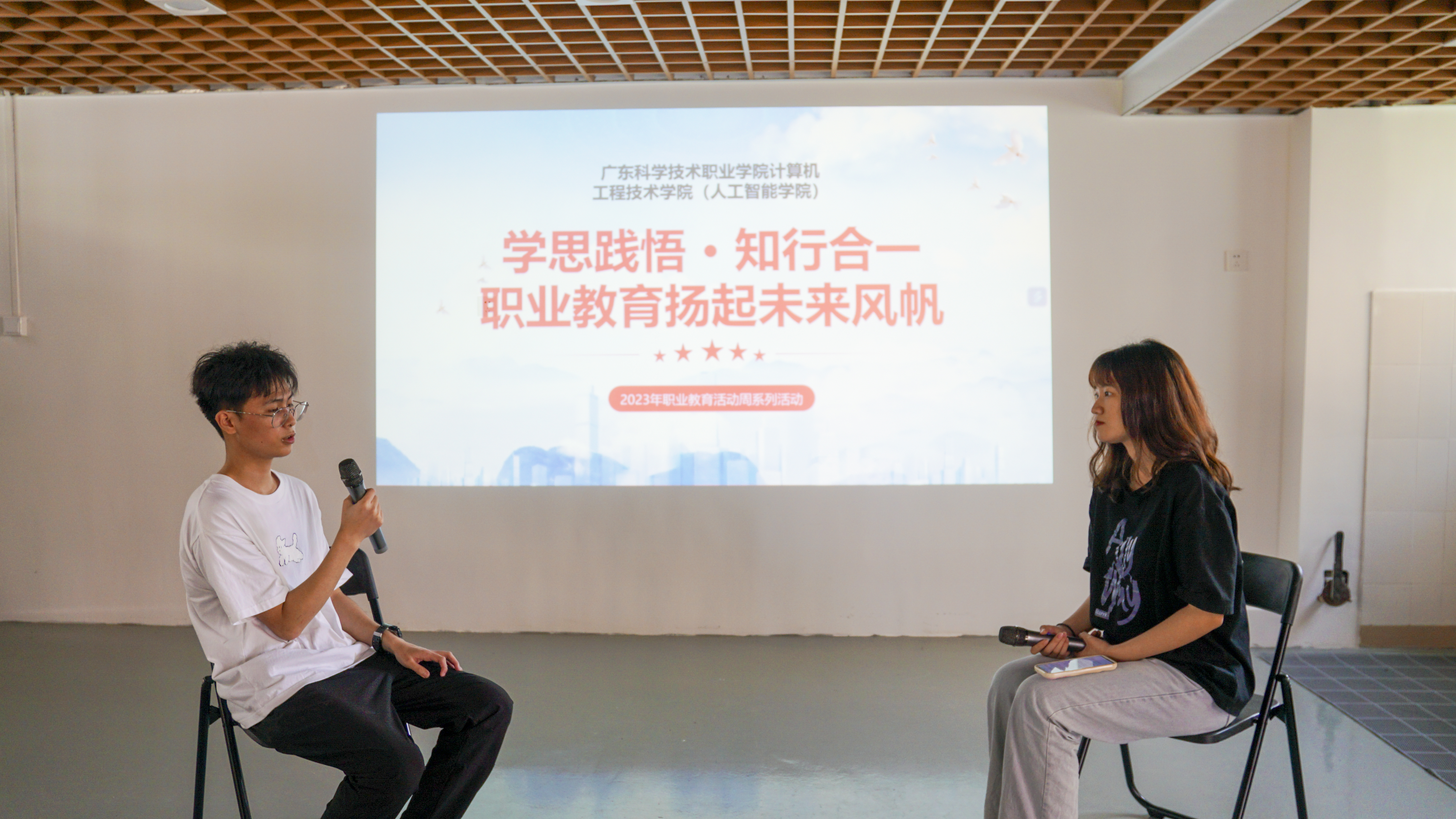本站讯 为学习贯彻习近平新时代中国特色社会主义思想主题教育,牢牢把握“学思想、强党性、重实践、建新功”总要求,大力弘扬劳动光荣、技能宝贵、创造伟大的时代风尚,5月19日,广东科学技术职业学院计算机工程技术学院(人工智能学院)职前工作室邀请2021届优秀校友滕福在华为苑“一站式”学生社区多功能会议室开展“学思践悟 知行合一”职业教育活动周系列活动之“职业教育扬起未来风帆”主题分享会。华为苑学生社区百余名师生参加了此次分享会。