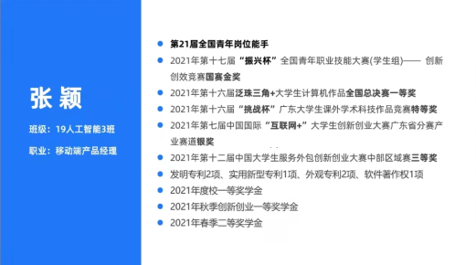 张颖结合在校的学习经历和比赛经历,分享了自己参加双创大赛的初心以及与双创大赛结缘后的大学生活。她勉励师弟师妹们把握机会、主动出击,坚持以赛促练、以赛促学,通过努力学习、辛勤劳动、创新创业建功立业、成就人生。