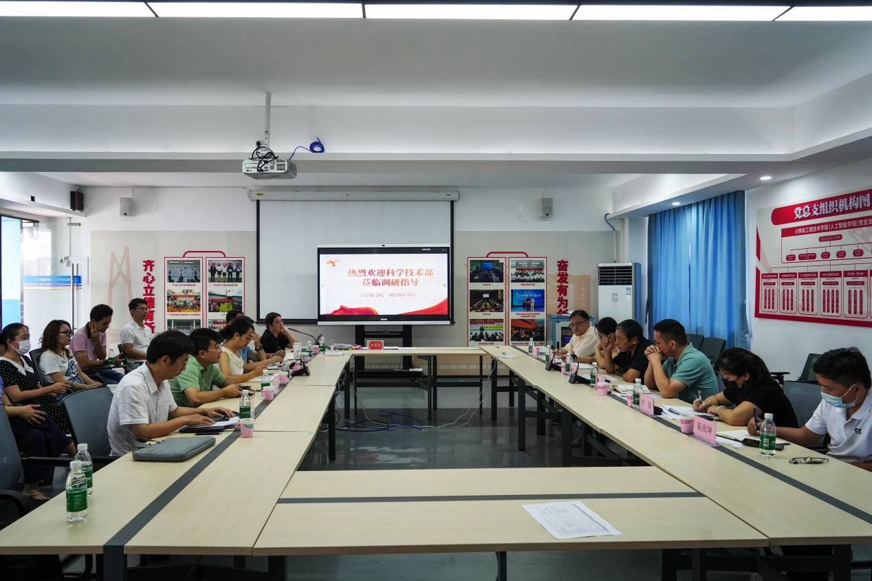 本站讯 6月8日上午,学校学术委员会主任、科学技术部部长余爱民教授,副部长阜艳、李广等一行6人到访计算机学院,以“聚焦科教融汇 助力区域经济高质量发展”为主题,围绕科研平台和产业学院建设、科研创新团队打造、区域重点企业需求挖掘、技术研发与成果转化等方面在J3-305开展调研交流。学院党总支书记陈哲,副书记吴国庆,副院长杨忠明、张军、赵曦等学院班子成员,以及主要科研平台和团队、产业学院、科研相关工作成员参与了本次调研交流活动。