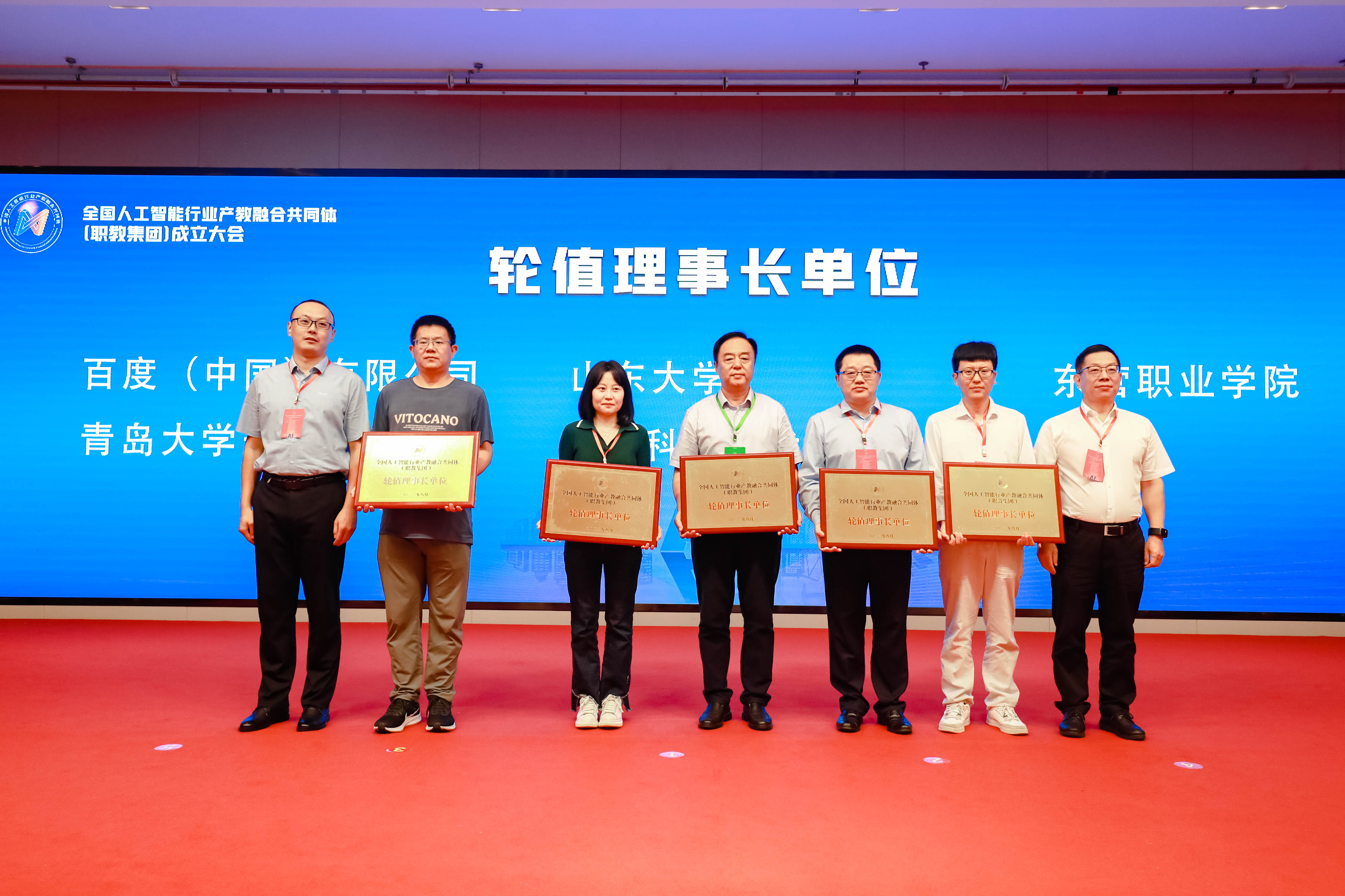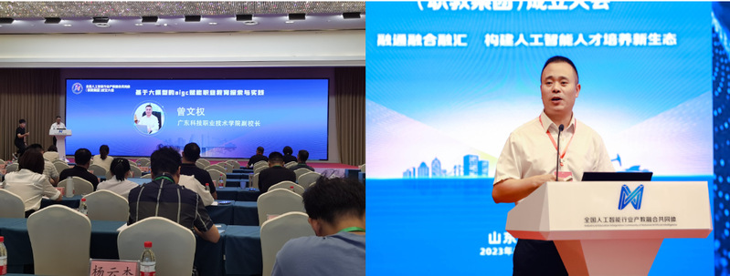 郝志强主任等8位嘉宾共同启动全国人工智能行业产教融合共同体(职教集团),并为5家轮值理事长单位、10家常务副理事长单位、10家副理事长单位进行了授牌。广东科学技术职业学院与百度(中国)有限公司、山东大学、青岛大学未来研究院、东营职业学院等5家单位成为首批轮值理事长单位。