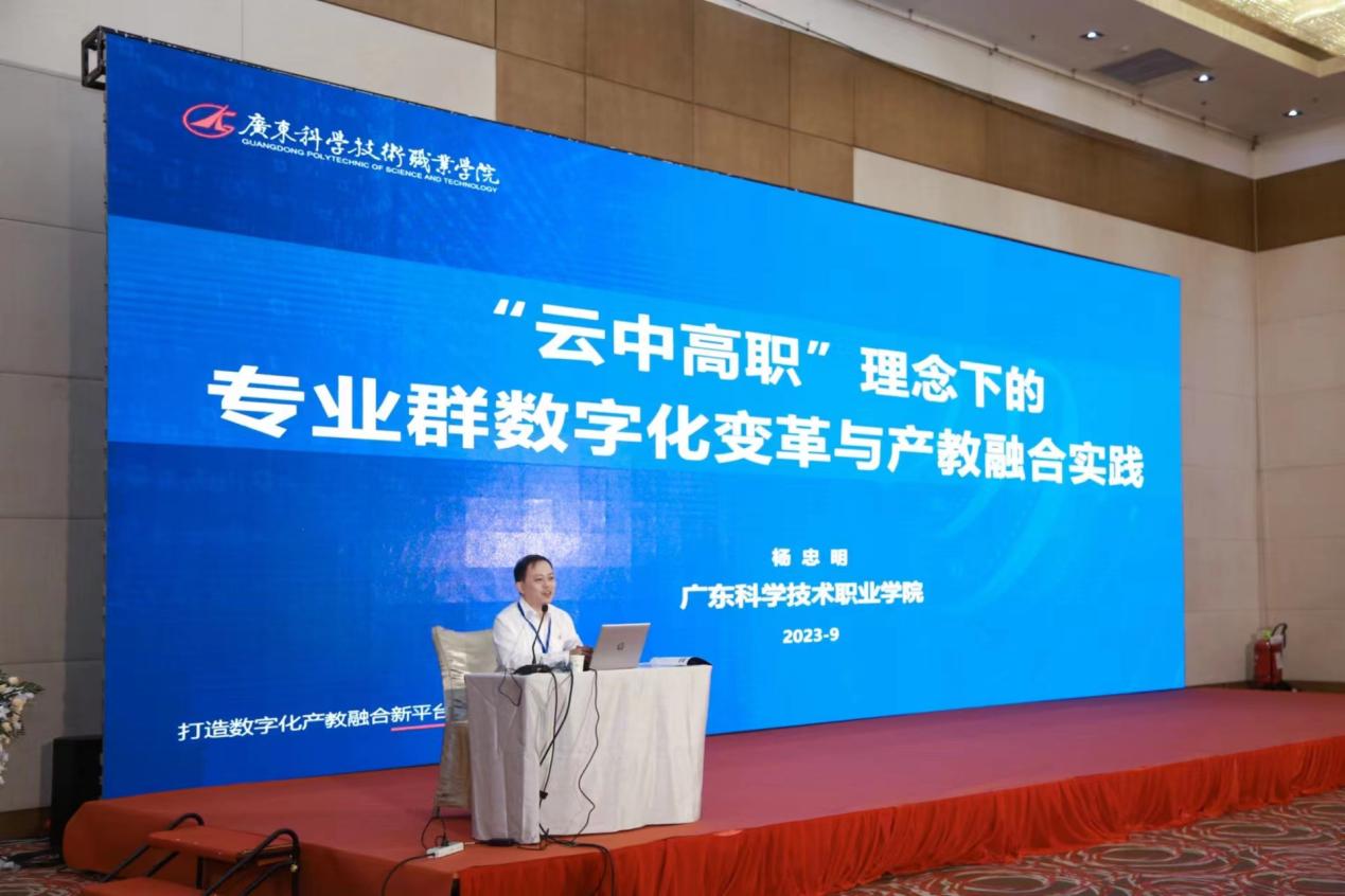 副院长杨忠明应邀作了题为《“云中高职”理念下的专业群数字化变革与产教融合实践》的专题报告,从“新挑战”“新实践”“新成效”三个维度,介绍了职业教育人才培养的新问题、职业院校面临的新挑战&新任务、广东科学技术职业学院办学特色,提出“云中高职”发展理念,开展高职数字化人才培养和数字化转型的研究,介绍了软件技术高水平专业群的数字化转型实践,在数字化人才培养方面取得的成绩,引发全场参会嘉宾的热烈反响。