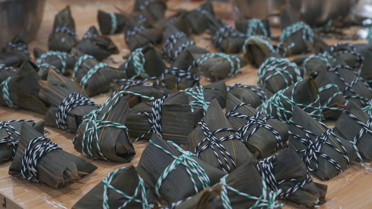 活动现场,同学们围坐在一起,捋粽叶、填糯米、压实、封口、捆扎,一系列动作行云流水,一气呵成。一双双灵巧的手,一张张翠绿的粽叶,一盆盆雪白的糯米,在同学们的共同努力下,变成了一个个棱角分明、粽香四溢的粽子。煮熟的粽子化作节日的问候,传递着来自学生社区的关怀与温暖,活动现场洋溢着欢乐融洽的节日氛围。