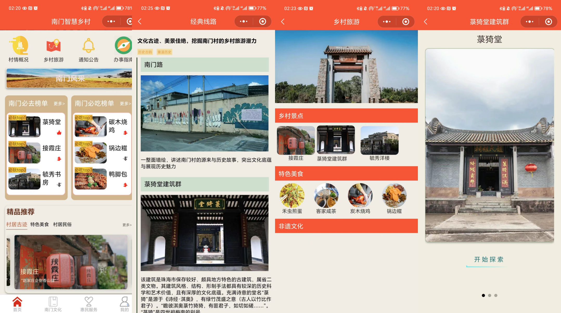 “智慧乡村”数字服务平台是实践团依托省级移动应用工程技术开发中心、校企合作研发并创新推广的项目。今年,实践团基于前年的成果进行创新,升级系统并创新推广至微信小程序,着力构建集乡村治理智慧化和文化旅游沉浸式融合一体的综合服务平台。该平台以村居古迹为灵魂、特色非遗美食为媒介、村居民俗为纽带,强化数据资源互联互通机制,为乡村振兴建设铺设坚实的数字化基石。今年“智慧乡村”数字服务平台引入游戏化旅游介绍,游客可通过便捷小程序,以图文并茂的方式穿梭于当地文化之中,全方位感受乡村文化的历史韵味与文化魅力。实践团以科技赋能,通过数字化手段解码文旅融合的乡村样本,生动呈现斗门镇南门村地方志独有资源。