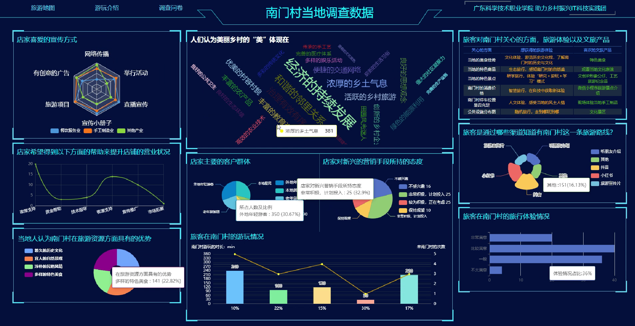 搭建可视化数据大屏是数字乡村战略规划中的关键一环。实践团成员对前期的问卷调查数据进行比对并图形化展示,运用先进的大数据处理与分析技术,对前年数据及大屏进行升级,匠心独运设计出数据可视化大屏并上传公开,建立“用数据说话、用数据决策、用数据管理、用数据创新”的管理机制,实现了南门村文旅资源的广泛覆盖、即时调取与深度剖析,保障数据直观可视化呈现,高效完整地传达各类调研信息,利用“数智”手段为南门村乡村治理效能的飞跃奠定了坚实基础。