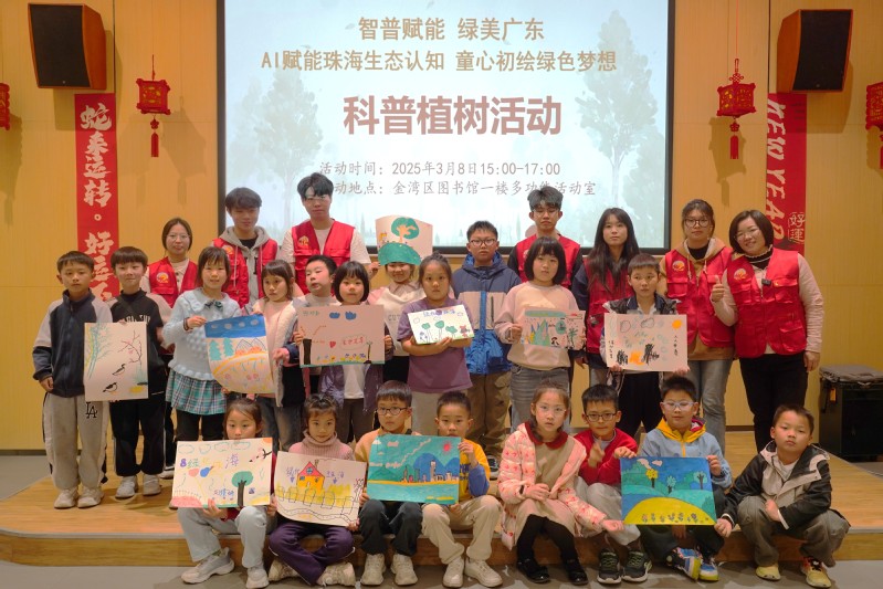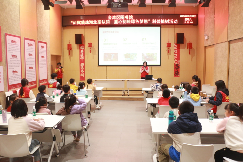本站讯 春风拂面,绿意盎然。3月8日下午,在植树节前夕,广东科学技术职业学院计算机工程技术学院(人工智能学院)(以下简称“学院”)厚德立志学生党支部“红木棉”党的创新理论宣讲队联合软件技术教师党支部、“红心绣”社区党团建设辅导员工作室、贾婀娜辅导员工作室,携手金湾区图书馆,共同开启了一场主题为“绿芽启智:AI赋能珠海生态认知,童心初绘绿色梦想”的科普宣讲与植树实践活动。这场融合党建引领、科技创新与生态教育的活动,为30名小学生带来了一场别开生面的生态科普之旅。