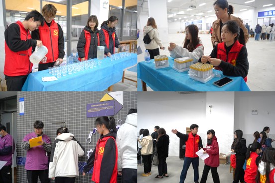 晨光熹微中,志愿者们已提前到岗熟悉流程,细致掌握体检各环节注意事项。在学院党总支的统一部署下,他们充分发挥党员先锋模范作用,以高度的责任感和使命感践行“全心全意为人民服务”的宗旨,将红色初心转化为守护同学健康的实际行动。志愿者们化身“红色向导”,积极配合医护人员维持检测秩序,耐心指引同学完成体检流程。流动的“红马甲”成为体检现场温暖的路标,显著提升服务效率,让体检工作既有“速度”更显“温度”。